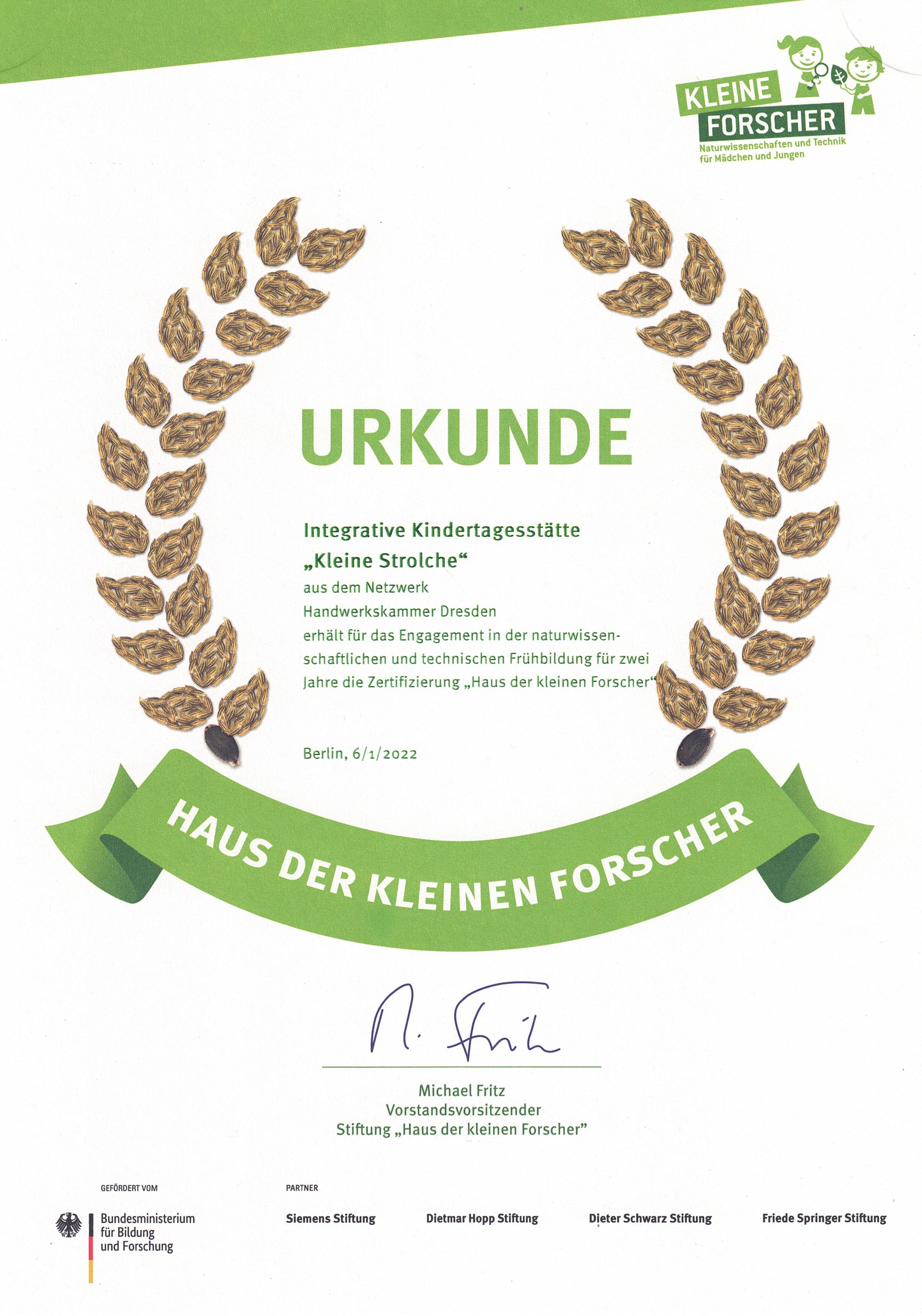 Wir sind sehr stolz darauf, dass unsere Integrative Kindertagesstätte "Kleine Strolche" zum "Haus der kleinen Forscher" im Juni 2022 zertifiziert wurde. Der Zertifizierungsprozess erstreckte sich über mehr als 24 Monate, in denen sich das Kita-Team zum Thema "Entdecken und Forschen" mit Fokus auf die MINT-Bildung (Mathematik, Informatik, Naturwissenschaft, Technik) in ihrer täglichen Arbeit weiterbildete. Es entstand ein Forscher und Entdeckerzimmer, welches seitdem von den Kinder mit großem Interesse genutzt wird. „Gemeinsam entdecken und erforschen wir den Alltag neu und geben den Kindern die Möglichkeit, die Umwelt mit ihren Augen zu sehen und zu begreifen.“ - das ist die neue Vision unserer Rietschener Kita, welche sich nun täglich im pädagogischen Alltag wiederspiegelt. Wir wünschen den Erzieherinnen und Kindern viel Erfolg dabei!